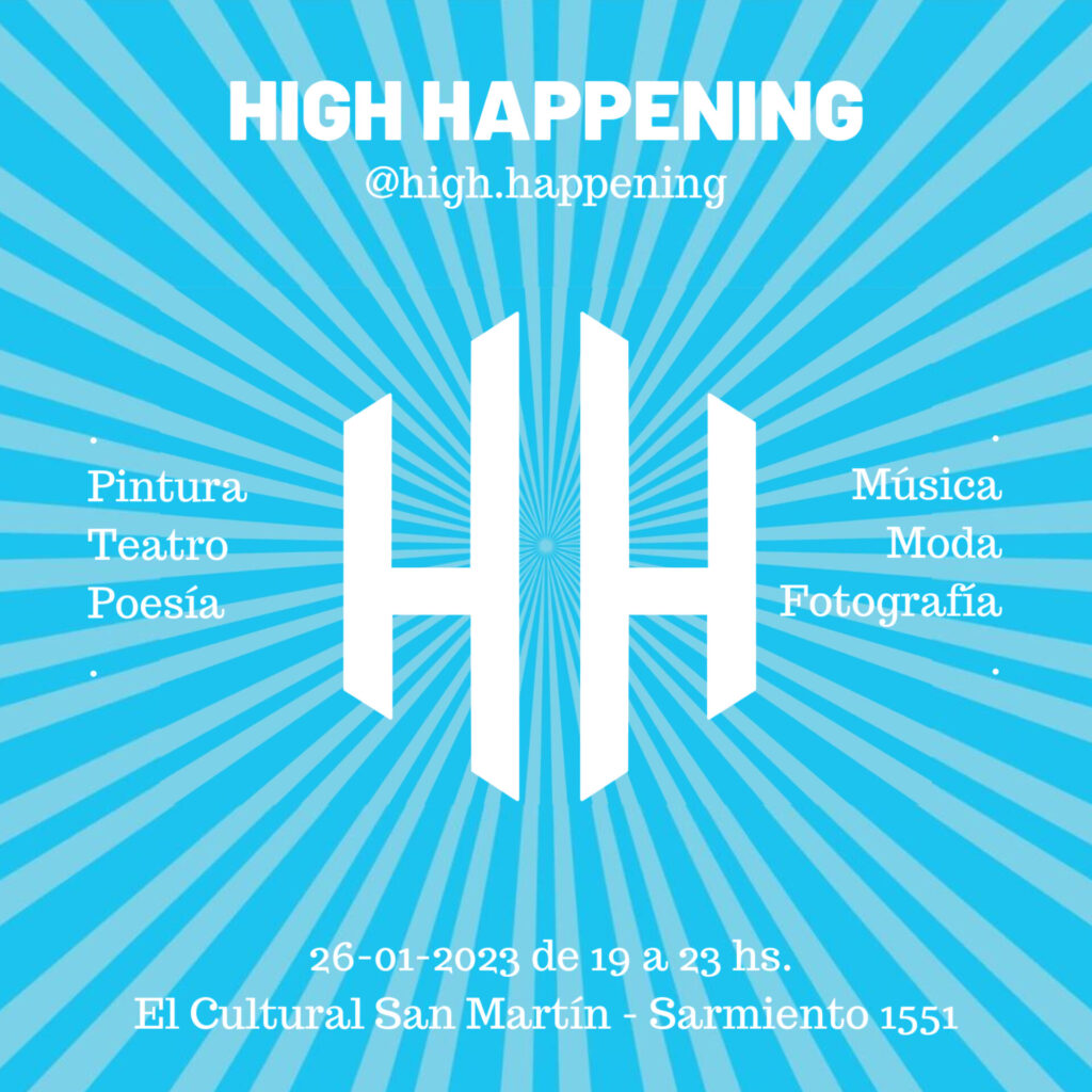 El Jueves 26 de enero de 19 a 23 horas se llevará a cabo la novena edición del High Happening: Una manifestación artística multidisciplinaria con performances de 15 minutos de teatro, música, poesía, pintura, fotografía y moda con intervalos de 15 minutos en donde el público degustará en forma gratuita vino. En el Cultural San Martín. Sarmiento 1551. CABA. Entradas en venta por Alternativa Teatral.  Valor de entrada general: $1200.-