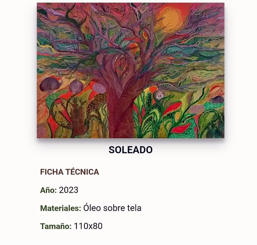 En la pintura “Soleado” (óleo sobre tela, 110 x 80 cm, año 2023) vibra con energía y vitalidad. El árbol central, se alza como un corazón vegetal desde el que se irradian ramas que parecen corrientes de vida. El uso de colores cálidos y luminosos genera una atmósfera de celebración.