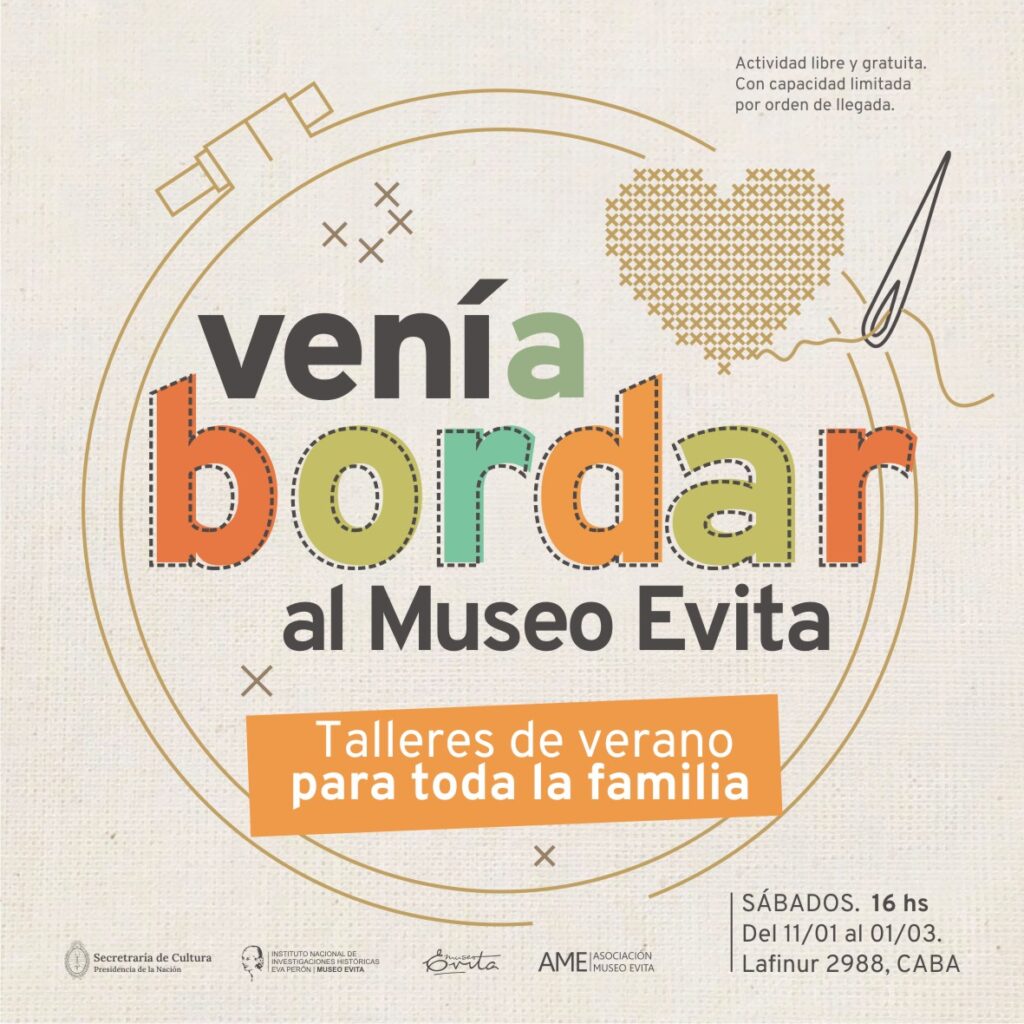 Toda la familia está invitada a los talleres de bordados que se realizarán durante el mes de enero, en el marco de la muestra “La máquina de los sueños” de Viviana Debicki. El ciclo de talleres “Bordar los sueños” se realizará, a partir del sábado 11, todos los sábados de enero y febrero a las 16 hs. Está dirigido a público de todas las edades, con o sin conocimientos previos de bordado. Habrá materiales para el trabajo manual, incluso para los chicos que podrán bordar con agujas de plástico. El taller “Bordar los sueños” es libre y gratuito, con capacidad limitada por orden de llegada.
