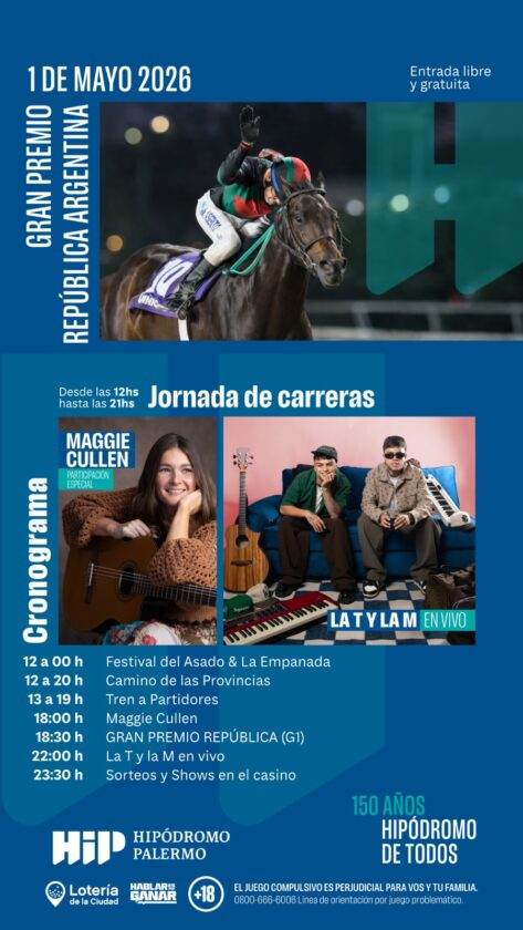 Este 1° de mayo, Hipódromo Palermo inicia las celebraciones por su 150° Aniversario en un evento único que combina la máxima adrenalina hípica con propuestas de entretenimiento para toda la familia: desde el mediodía y con entrada libre y gratuita, las puertas se abrirán para una jornada histórica con carreras internacionales, festival del asado, juegos para chicos, espectáculos de primer nivel y sorteos.