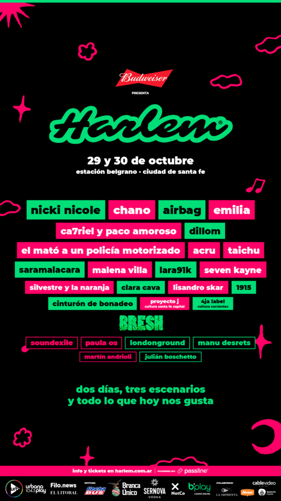 Este fin de semana llega la cuarta edición del Harlem Festival con un mega line up que propone, una grilla pensada y creada para reunir a todas las edades de la última generación, reuniendo lo mejor de la escena actual, Nicki Nicole una de las artistas Argentinas con mayor proyección internacional, Chano, el ex líder de Tan Bionica regresa a la ciudad tras 8 años de su última visita, Airbag el trío de los hermanos Sardelli aportando su cuota de rock pop debutan en el festival al igual que El Mato un Policia Motorizado. El creador del exitosísimo Post Mortem, uno de los mejores discos del último tiempo, Dillom debutará en el escenario principal al igual que Emilia Mernes.