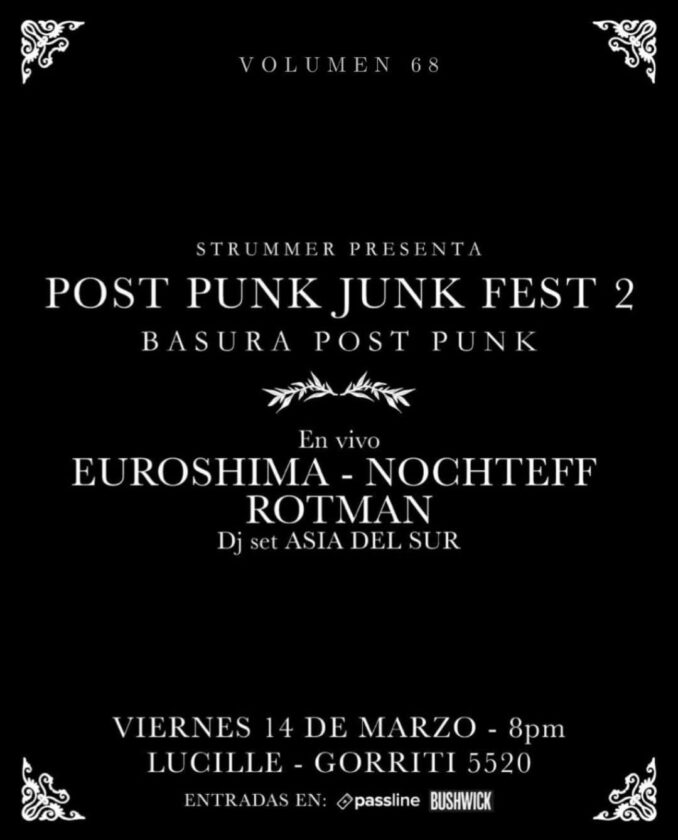 Sergio Rotman y Strummer Bar presentan la segunda edición del BASURA POST PUNK FEST esta vez con las presencias del ex MUERAN HUMANOS y DIOS NOCHTEFF; Tomás Nochteff; y el regreso de LA banda post punk de los 80 EUROSHIMA, más el mismísimo ROTMAN y su banda .