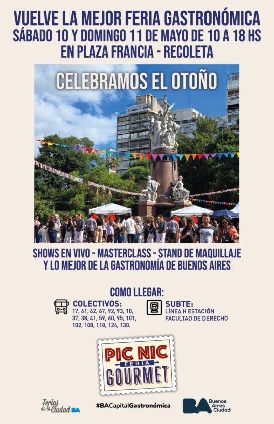 El sábado 10 y domingo 11 de mayo, de 10 a 18 hs, Plaza Francia se convierte en el punto de encuentro para los amantes de la buena comida y el aire libre, con una nueva edición de Feria Picnic Gourmet. Ya consolidada como un clásico porteño, esta feria itinerante que rinde homenaje a los picnics a través de los sabores del mundo, festeja el otoño, acompañado de música en vivo y relax en el este lugar emblema de Recoleta.