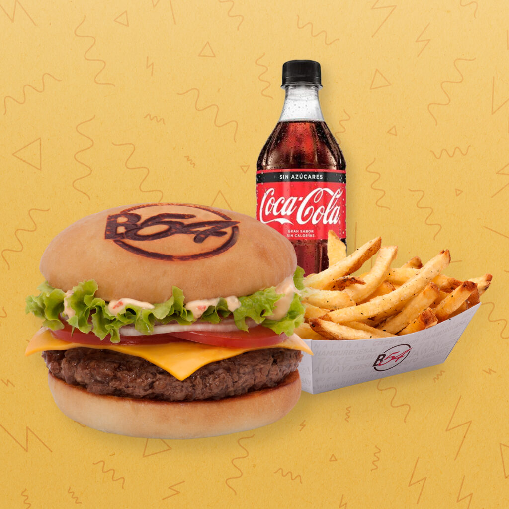 Este combo está integrado por una B54 Cheeseburger (hamburguesa casera con queso cheddar, lechuga, tomate, cebolla y salsa burger54); una deliciosa porción de French Fries McCain y para beber, una refrescante Coca Cola Zero.