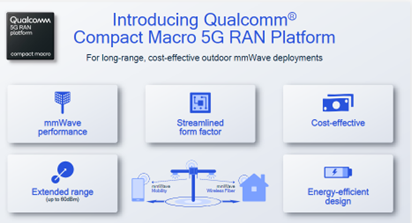 mmWave ha demostrado un enorme potencial para las redes 5G exteriores de área amplia, aunque es crítico abordar los retos del TCO (Coste Total de Propiedad) para que esta desarrolle todo su potencial. La nueva Plataforma Qualcomm Compact Macro 5G RAN tiene como objetivo abordar estos desafíos de frente, ofreciendo mejoras en el rendimiento de largo alcance para productos macro compactos que duplican las capacidades de alcance, en comparación con las células pequeñas diseñadas con la Plataforma Qualcomm FSM 5G RAN, reduciendo significativamente el número de sitios de celdas necesarios para la cobertura de área amplia. Además, al evolucionar la Plataforma Qualcomm FSM 5G RAN para Células Pequeñas, esta solución macro compacta es capaz de abordar la eficiencia energética común, tamaño y complejidades de coste de las soluciones macro comparables, haciendo que los despliegues sean más accesibles.